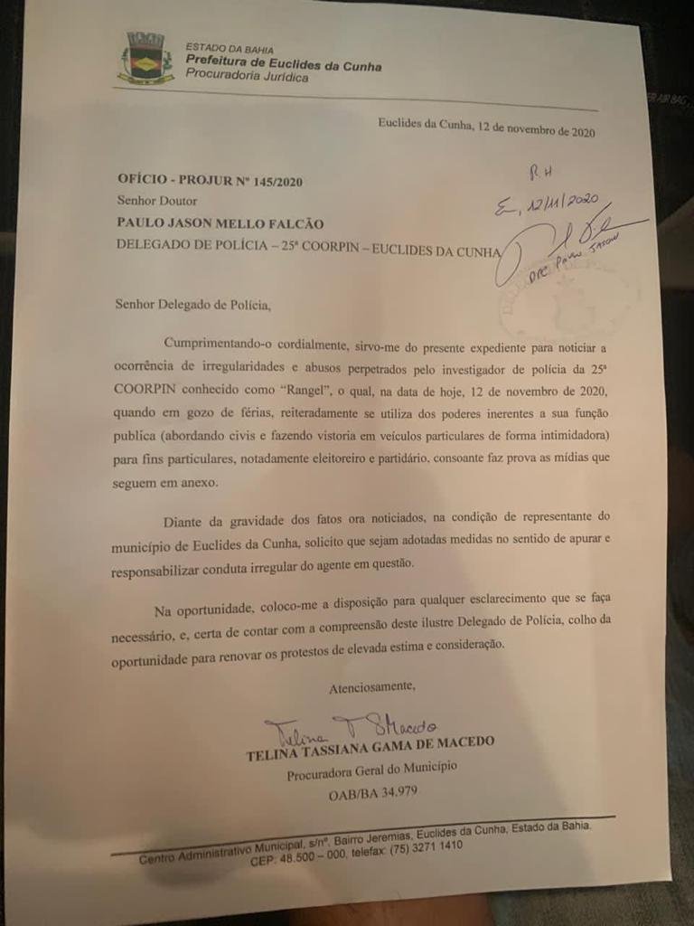 A Procuradoria Geral do Município (PGM) de Euclides da Cunha, localizado no Semiárido baiano, notificou o delegado da 25ª COORPIN para noticiar “irregularidades e abusos” cometidas por um policial civil que atua na cidade.